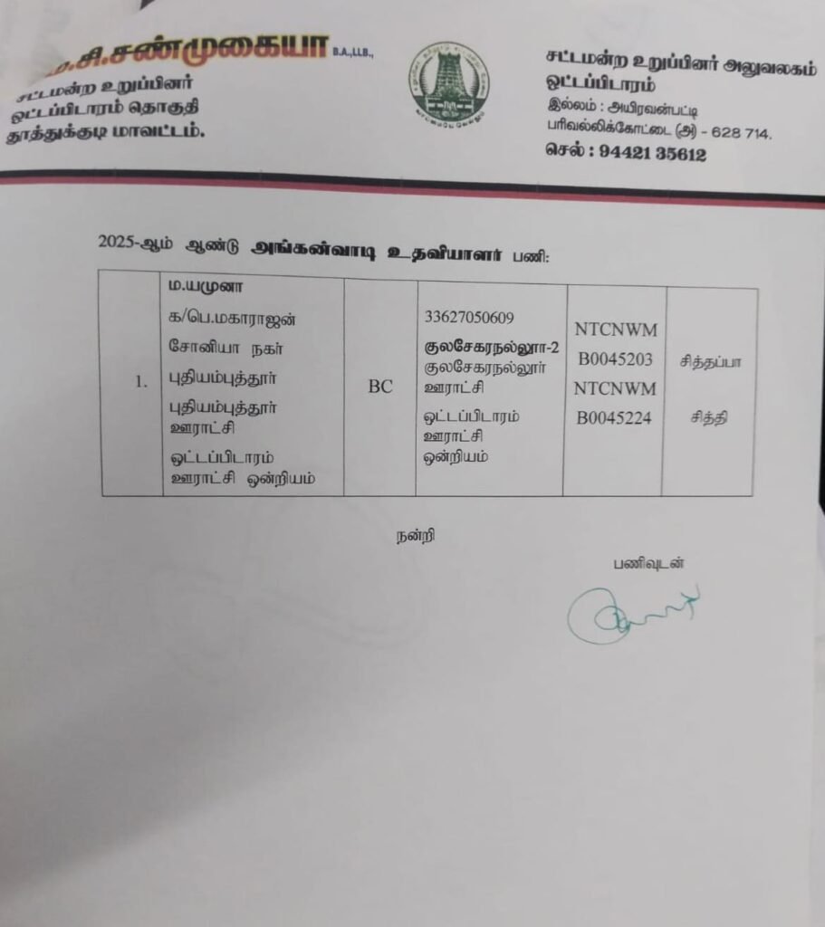 தூத்துக்குடி மாவட்டம் ஒருங்கிணைந்த குழந்தை வளர்ச்சித் திட்டப் பணிகளின் கீழ் இயங்கி வரும் அங்கன்வாடி மையங்களுக்கான அங்கன்வாடி பணியாளர் மற்றும் உதவியாளர்களுக்கான 2025 ஆம் ஆண்டிற்கான காலிப் பணியிடங்களானது தூத்துக்குடி மாவட்டம் ஓட்டப்பிடாரம் சட்டமன்ற தொகுதிக்கு உட்பட்ட கலப்பைப்பட்டி, மேல மீனாட்சிபுரம், இராமசந்திரபுரம், எஸ்.புதூர், நடுவக்குறிச்சி, அம்மாள்பட்டி, தென்னம்பட்டி, மேலப்பூவாணி, கொல்லங்கிணறு, கீழப்பூவாணி, இளவேலங்கால், வல்லக்குளம், கல்லத்திக்கிணறு, அகிலாண்டபுரம், பனையூர், வேப்பங்குளம், சாமிநத்தம், தங்கமணிநகர், ஆரைக்குளம், பெரியநத்தம், தருவைகுளம், ஆலந்தா, மருதன்வாழ்வு, மாப்பிள்ளையூரணி கே.எஸ்.நகர், குறுக்குச்சாலை, பரிவில்லிக்கோட்டை, சவலாப்பேரி, சிந்தலக்கோட்டை, வடமலாபுரம், நாரைக்கிணறு, மணியாச்சி, சொக்கநாதபுரம், மேட்டூர், புதியம்புத்தூர், குலசேகரநல்லூர் ஆகிய கிராமங்களில் உள்ள அங்கன்வாடி மையங்களில் காலிப் பணியிடங்கள் உள்ளன.